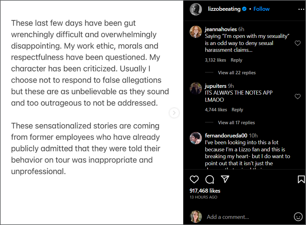 **From [Page Six](https://archive.is/20230802173252/https://pagesix.com/2023/08/01/lizzo-sued-by-dancers-for-allegedly-forcing-them-to-watch-sex-shows/):**
