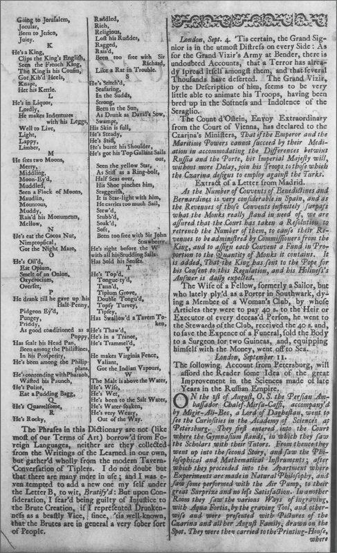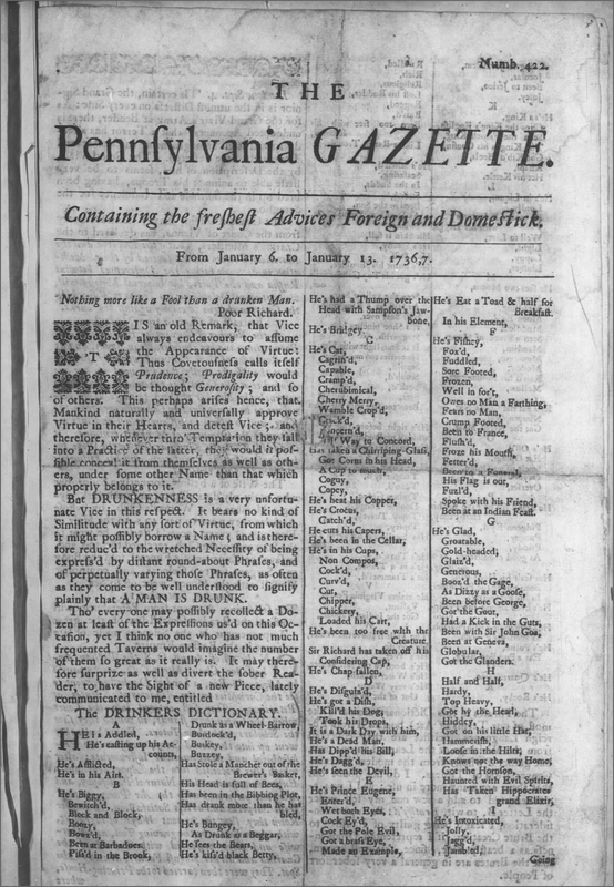 Before then, in early 1737, Benjamin Franklin penned anonymous articles for The Pennsylvania Gazette under the pseudonym Silence Dogood, centered around alcohol. This has since become known as [The Drinker's Dictionary](https://archive.is/iepFF).