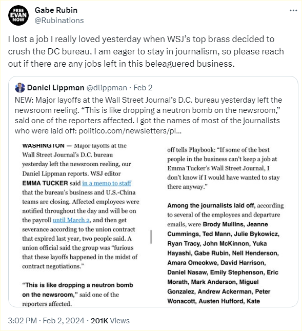 > LAYOFFS DECIMATE WSJ IN WASHINGTON — Major layoffs at the [[The Wall Street Journal|Wall Street Journal]]’s D.C. bureau yesterday left the newsroom reeling, our Daniel Lippman reports. WSJ editor EMMA TUCKER said in a memo to staff that the bureau’s business and U.S.-China teams are closing. Affected employees were notified throughout the day and will be on the payroll until March 2, and then get severance according to the union contract that expired last year, two people said. A union official said the group was “furious that these layoffs happened in the midst of contract negotiations.”
