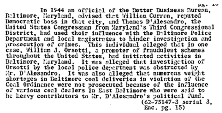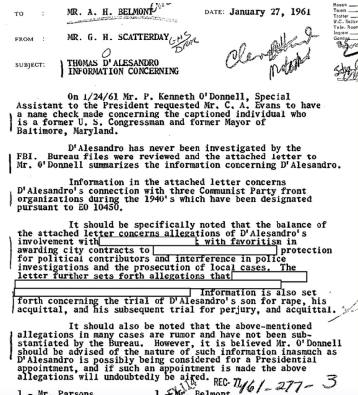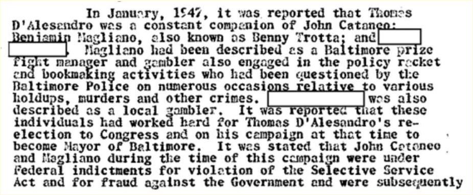 [^2]: Thomas D' Alesandro Jr.; FBI Records Vault; https://vault.fbi.gov/thomas-dalesandro-jr/thomas-d-alesandro-jr.-part-01-of-01/view — [Archive](https://web.archive.org/web/20231108104920/https://vault.fbi.gov/thomas-dalesandro-jr/thomas-d-alesandro-jr.-part-01-of-01/)